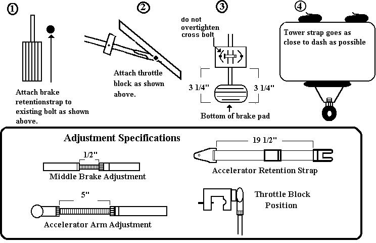 2005 F-150 Model # S22321 Use left offset lower brake arm. S MEANS YOU INVERT THE ACCELERATOR TUBE END FOR END. Use the illustration below for reference to install the AUTOMOBILITY hand control in eight steps. 1. Remove the lower retention strap from the accelerator arm and install as shown in illustration (1) When taking the bolt out for the retention strap, make sure the spring is put back in place. 2. Attach the throttle block on the accelerator arm as shown in illustration (2). 3. Attach the lower brake assembly above the brake pedal at the height shown in illustration (3). 4. Lift the brake arm and attach the column mount. 5. Attach the accelerator arm to the control handle . 6. Attach the lower retention strap to the upper short retention strap on the accelerator arm. 7. Attach the lower spring retention strap and adjust. Make sure cross bolt is not overtightened and binding. 8. Safety Check Be sure to check that bolts and nuts are properly tightened, you should have full throttle and full brakes. The system must go through the brake and throttle motions smoothly, there should be no binding or hesitation. |