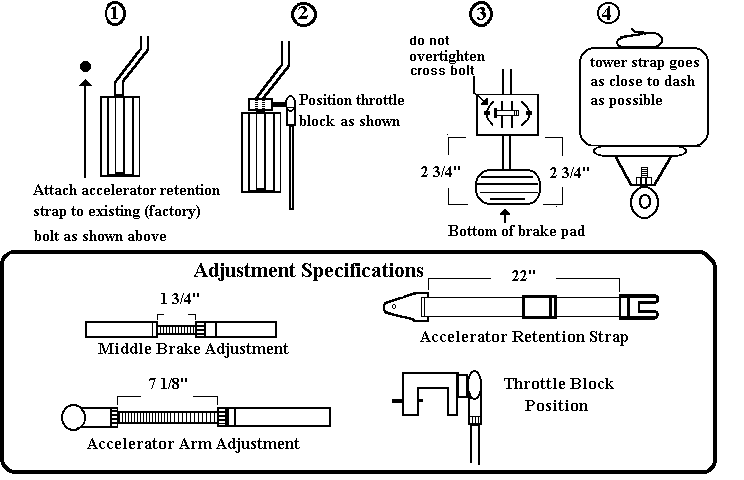 2005 Mustang Model # S-23321 Use straight lower brake arm. S MEANS YOU CUT THROTTLE BLOCK WITH 1'' OPENING AND SWITCH ACCELERATOR TUBE END FOR END Use the illustration below for reference to install the AUTOMOBILITY hand control in eight steps. 1. Remove the lower retention strap from the accelerator arm and install as shown in illustration (1) 2. Attach the throttle block on the accelerator arm as shown in illustration (2). 3. Attach the lower brake assembly above the brake pedal at the height shown in illustration (3). 4. Lift the brake arm and attach the column mount. 5. Attach the accelerator arm to the control handle . 6. Attach the lower retention strap to the upper short retention strap on the accelerator arm. 7. Attach the lower spring retention strap and adjust. Make sure cross bolt is not overtightened and binding. 8. Safety Check Be sure to check that bolts and nuts are properly tightened, you should have full throttle and full brakes. The system must go through the brake and throttle motions smoothly, there should be no binding or hesitation. |