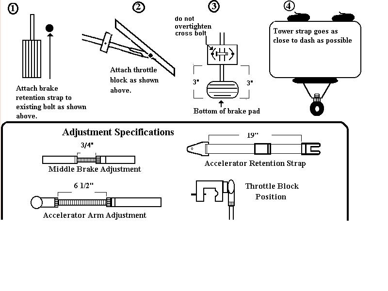 2006 F-250 Model # 23221 Use straight lower brake arm. "USE CUT THROTTLE BLOCK" Use the illustrations below for reference to install the AUTOMOBILITY 901 in eight steps 1. Remove the lower retention strap from the accelerator arm and install as shown in illustration (1). When taking the bolt out for the retention strap, make sure the spring is put back in place. 2.Attach the throttle block on the accelerator arm as shown in illustration (2). 3.Attach the lower brake assembly above the brake pedal at the height shown in illustration (3). 4.Lift the brake arm and attach the column mount 5.Attach the brake arm and accelerator arm to the control handle 6.Attach the lower retention strap to the upper short retention strap on the accelerator arm. 7.Attach the lower spring retention strap and adjust. Make sure cross bolt is not overtightened and binding. 8. Safety check. Be sure to check that bolts and nuts are properly tightened, you should have full throttle and full brake. The system must go through the brake and throttle motions smoothly, there should be no binding or hesitation. ** Tilt lever must be removed once set.*** |