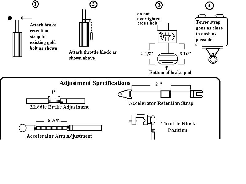 2006 Escape Model # 23221 Use straight lower brake arm. Use the illustrations below for reference to install the AUTOMOBILITY 901 in eight steps 1. Remove the lower retention strap from the accelerator arm and install as shown in illustration (1). 2.Attach the throttle block on the accelerator arm as shown in illustration (2). 3.Attach the lower brake assembly above the brake pedal at the height shown in illustration (3). 4.Lift the brake arm and attach the column mount 5.Attach the brake arm and accelerator arm to the control handle 6.Attach the lower retention strap to the upper short retention strap on the accelerator arm. 7.Attach the lower spring retention strap and adjust. Make sure cross bolt is not overtightened and binding. 8. Safety check. Be sure to check that bolts and nuts are properly tightened, you should have full throttle and full brake. The system must go through the brake and throttle motions smoothly, there should be no binding or hesitation. *** Vehicle can only be driven in the full up position or first notch down from full up position. |