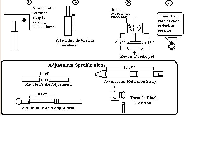 2006 Ford Focus Model # 23321 Use straight lower brake arm. Invert accelerator tube end for end. Use the illustration below for reference to install the AUTOMOBILITY hand control in eight steps. 1. Remove the lower retention strap from the accelerator arm and install as shown in illustration (1) 2. Attach the throttle block on the accelerator arm as shown in illustration (2). 3. Attach the lower brake assembly above the brake pedal at the height shown in illustration (3). 4. Lift the brake arm and attach the column mount. 5. Attach the accelerator arm to the control handle . 6. Attach the lower retention strap to the upper short retention strap on the accelerator arm. 7. Attach the lower spring retention strap and adjust. Make sure cross bolt is not overtightened and binding. 8. Safety Check Be sure to check that bolts and nuts are properly tightened, you should have full throttle and full brakes. The system must go through the brake and throttle motions smoothly, there should be no binding or hesitation. ****Note: Cannot use tilt once hand control is installed so you have to find the position you feel comfortable with first. Switch accelerator tube end for end. |