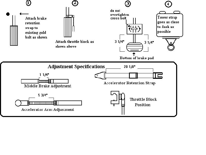 2006 Mercury Grand Marquis Model # 23221 Use straight lower brake arm. Use the illustration below for reference to install the AUTOMOBILITY hand control in eight steps. 1. Remove the lower retention strap from the accelerator arm and install as shown in illustration (1) 2. Attach the throttle block on the accelerator arm as shown in illustration (2). 3. Attach the lower brake assembly above the brake pedal at the height shown in illustration (3). 4. Lift the brake arm and attach the column mount. 5. Attach the accelerator arm to the control handle . 6. Attach the lower retention strap to the upper short retention strap on the accelerator arm. 7. Attach the lower spring retention strap and adjust. Make sure cross bolt is not overtightened and binding. 8. Safety Check Be sure to check that bolts and nuts are properly tightened, you should have full throttle and full brakes. The system must go through the brake and throttle motions smoothly, there should be no binding or hesitation. |