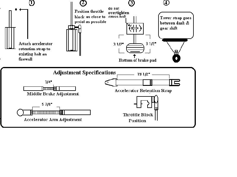 2006 Ford Taurus Model # 23221 Use straight lower brake arm. Use the illustration below for reference to install the AUTOMOBILITY hand control in eight steps. 1. Remove the lower retention strap from the accelerator arm and install as shown in illustration (1) 2. Attach the throttle block on the accelerator arm as shown in illustration (2). 3. Attach the lower brake assembly above the brake pedal at the height shown in illustration (3). 4. Lift the brake arm and attach the column mount. 5. Attach the accelerator arm to the control handle . 6. Attach the lower retention strap to the upper short retention strap on the accelerator arm. 7. Attach the lower spring retention strap and adjust. Make sure cross bolt is not overtightened and binding. 8. Safety Check Be sure to check that bolts and nuts are properly tightened, you should have full throttle and full brakes. The system must go through the brake and throttle motions smoothly, there should be no binding or hesitation. ****Note: Cannot use tilt once hand control is installed so you have to find the position you feel comfortable with first. Switch accelerator tube end for end. |