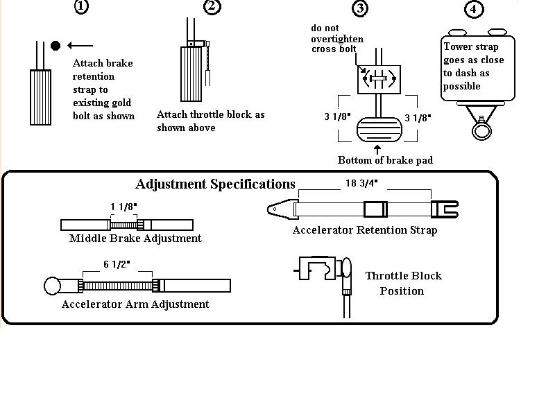 2007 F-350 Super Duty Model # S-23221 "S" means use cut throttle block. Use straight lower brake arm. Use the illustrations below for reference to install the AUTOMOBILITY 901 in eight steps 1. Remove the lower retention strap from the accelerator arm and install as shown in illustration (1). 2.Attach the throttle block on the accelerator arm as shown in illustration (2). 3.Attach the lower brake assembly above the brake pedal at the height shown in illustration (3). 4.Lift the brake arm and attach the column mount 5.Attach the brake arm and accelerator arm to the control handle 6.Attach the lower retention strap to the upper short retention strap on the accelerator arm. 7.Attach the lower spring retention strap and adjust. Make sure cross bolt is not overtightened and binding. 8. Safety check. Be sure to check that bolts and nuts are properly tightened, you should have full throttle and full brake. The system must go through the brake and throttle motions smoothly, there should be no binding or hesitation. |