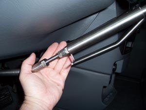 side bottom, thread the strap through the tower and back up through the camlock buckle. (On some vehicles the strap will come down behind the gear shift lever or ignition switch and once threaded will come back up on the front side over the lever or switch,) Pull the strap until the tower and straps are secured to the steering column, lock the camlock buckle and slide the security ring over the camlock handle. Thread through the second camlock and secure. Be sure that this tower strap is tightly in place before attaching the Velcro strap to the brake block. To change or adjust the lower brake arm slide the cover up, using the provided allan wrench loosen the allan lock nut, then using 2 9/16ths wrenches loosen the outside jam nut, then the inside locking jam nut. This threaded rod is a left hand thread. Make sure you turn it the proper way to loosen it. Once you have completed this adjustment, slide the cover over the adjusters. |